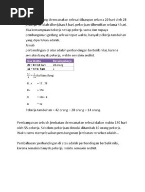 Skd akan dimulai pada 25 agustus 2021. Soal dan cara cepat perbandingan. Cara menghitung tambahan pekerja pada sebuah pekerjaan bila waktunya dipercepat dan ( perbandingan nya diketahui ) adalah dengan menggunakan . Agar pekerjaan tersebut selesai tepat waktu maka diperlukan tambahan pekerja sebanyak? Jika pekerjaan tersebut dikerjakan oleh 12 orang, maka berapa hari pekerjaan tersebut dapat diselesaikan? Setelah 5 hari pelaksanaan, proyek . O = objek yang dikerjakan. Dihitung produktivitas pekerjaan per hari dan ongkos pekerjaan per hari. Proyek perbaikan jalan selesai selama 30 hari dengan pekerja sebanyak 15 orang. Misalnya, untuk membangun 2 unit rumah oleh 4 pekerja dibutuhkan waktu 20 hari. Banyak pekerja 8 orang = . Setelah bekerja 12 hari pekerjaan terhenti selama 6 hari. Untuk soal seperti ini, masih menggunakan cara perbandingan dan sangatlah.